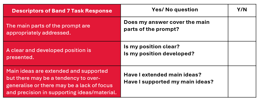 Once you have written out the band descriptors as questions, this is the checklist you can use to assess your writing. You might want to format this into a table, like the one below: